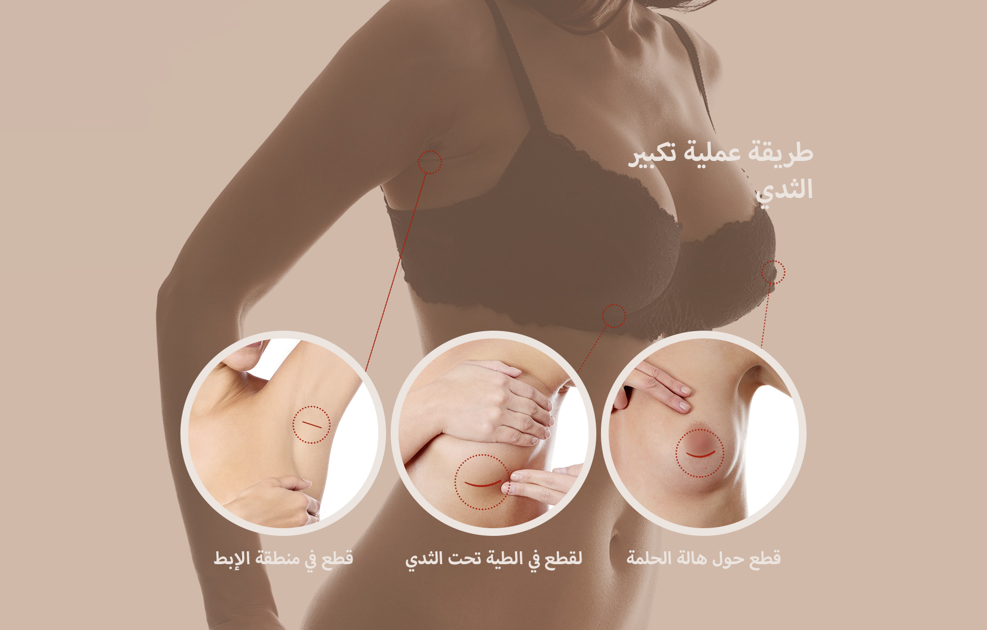 هناك ثلاث طرق للشق في جراحة تكبير الثدي. يتم اختيار الطريقة استنادًا إلى حالة المريضة وتحليل قبل الجراحة