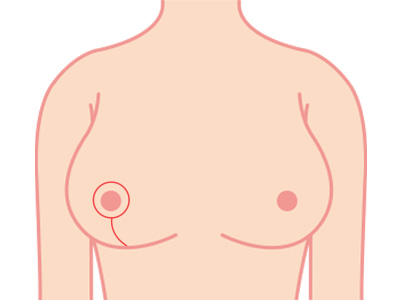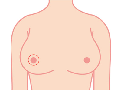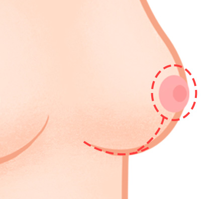 الثدي الطبيعي: تقع الحلمات على بعد 4-5 سم فوق الطية تحت الثدي